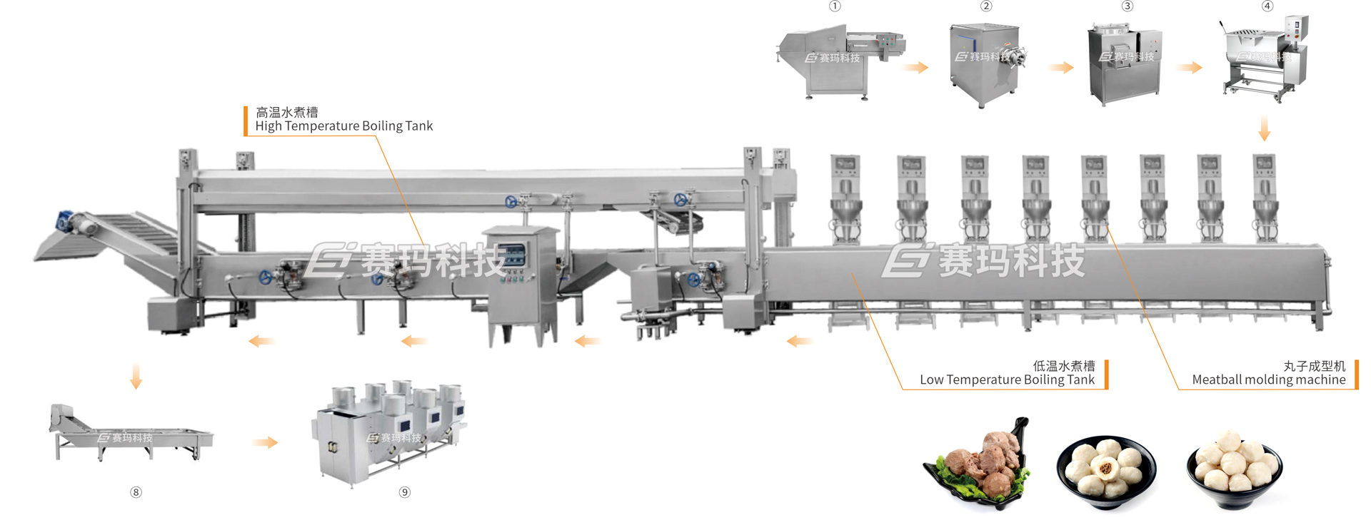 本线采用SUS304不锈钢制作,通过热水循环泵、刮板及输送条的配合下使成型、蒸煮后的肉丸平稳整齐的输送到冷却槽或速冻隧道等。蒸煮段采用全密封设计,更加节能并有效防止食品的二次污染,各段连接处均为无缝连接,带有自动提升功能和安全防护装置,清洗更加方便快捷、安全。采用全自动恒温变频控制功能、自动加料功能等,减少劳动强度,降低生产成本。